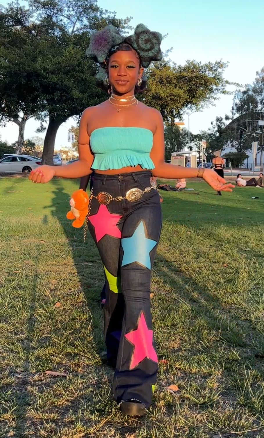 Bold, hand-painted denim with oversized neon stars in pink, blue, green, and purple. High-waisted with a retro flare fit, these jeans are wearable art made to stand out anywhere you go.